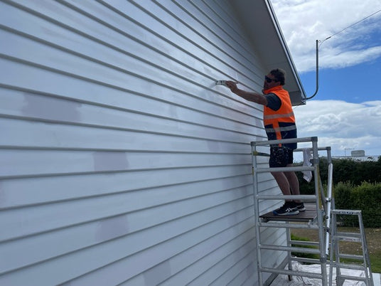 Application in progress using micron rollers and a tipping brush to achieve a smooth, professional finish on ply board ceilings with rich colour depth and protection.