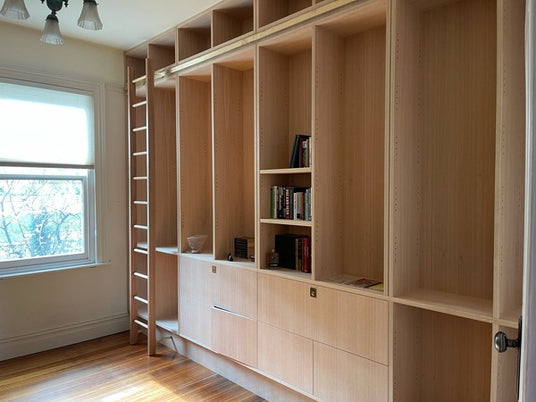 Custom timber shelving and cabinetry installed to create a refined and functional cigar room with a warm, natural finish.