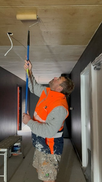 Application in progress using micron rollers and a tipping brush to achieve a smooth, professional finish on ply board ceilings with rich colour depth and protection.