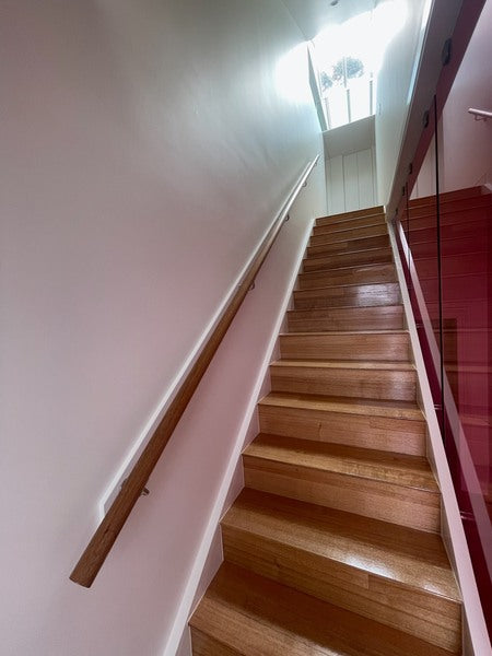 A sleek timber staircase enhanced with natural light and clean finishes, highlighting modern design and craftsmanship.
